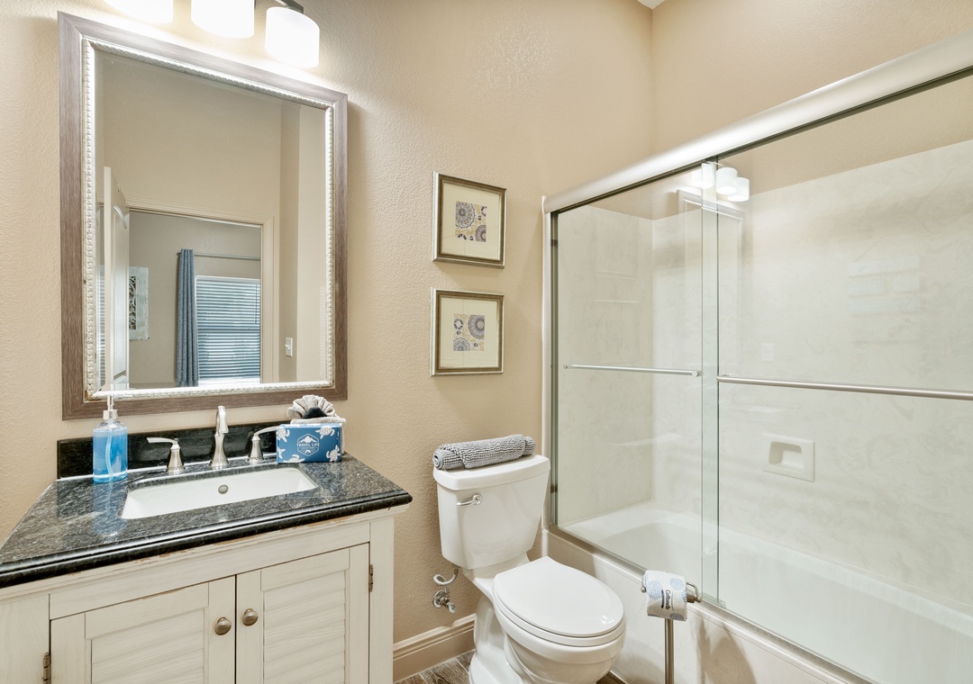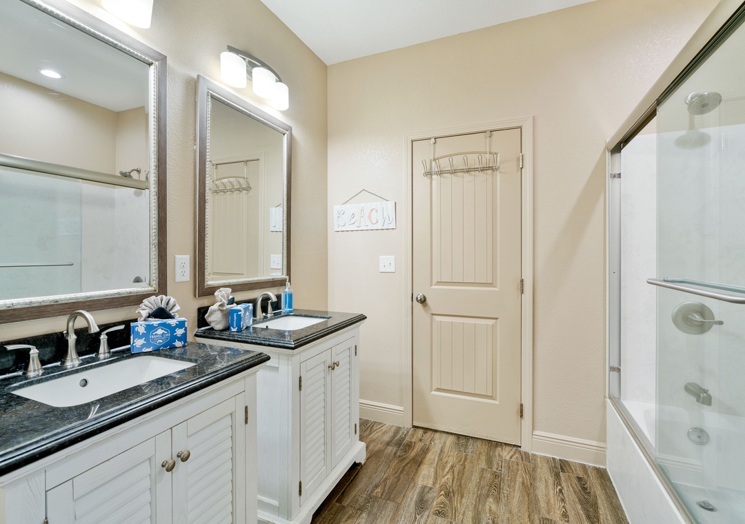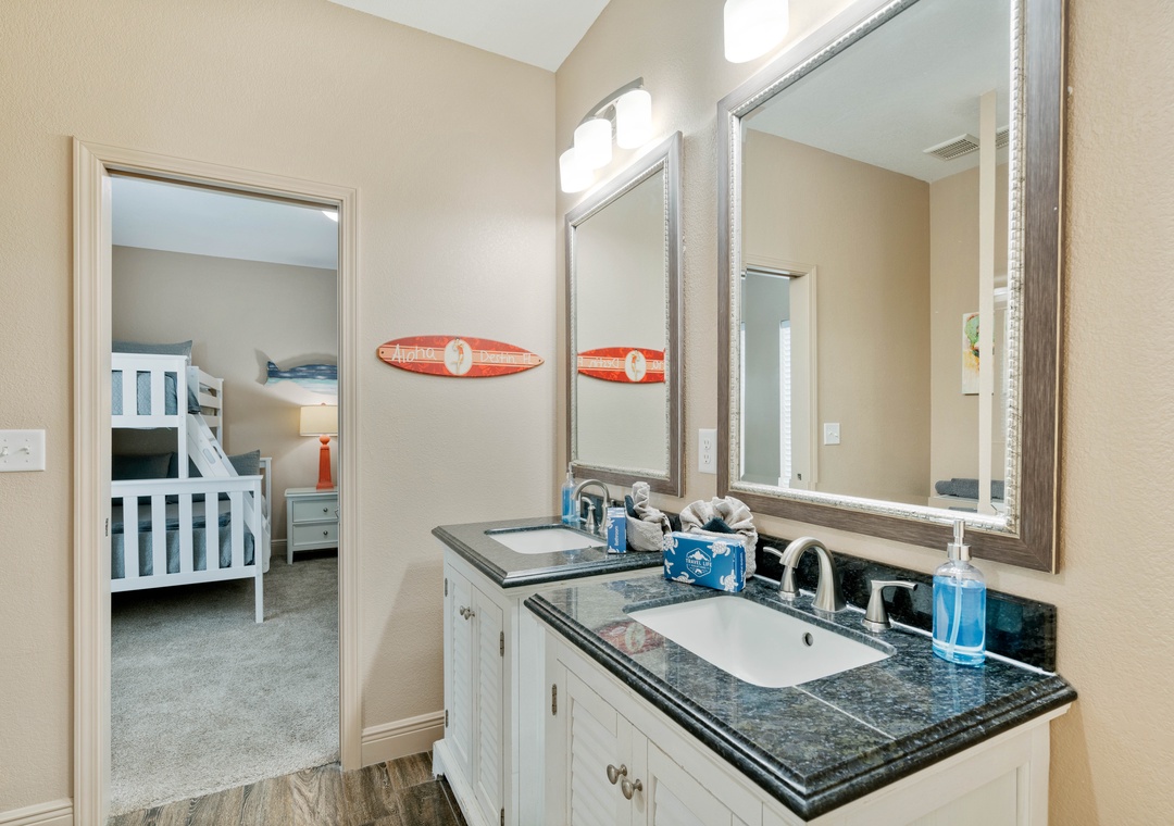 BATHROOM #4 (Jack-and-Jill)): This spacious bathroom is shared between the bunk room (#5) and a king suite (#6). It has two vanities and a tub/shower combination.