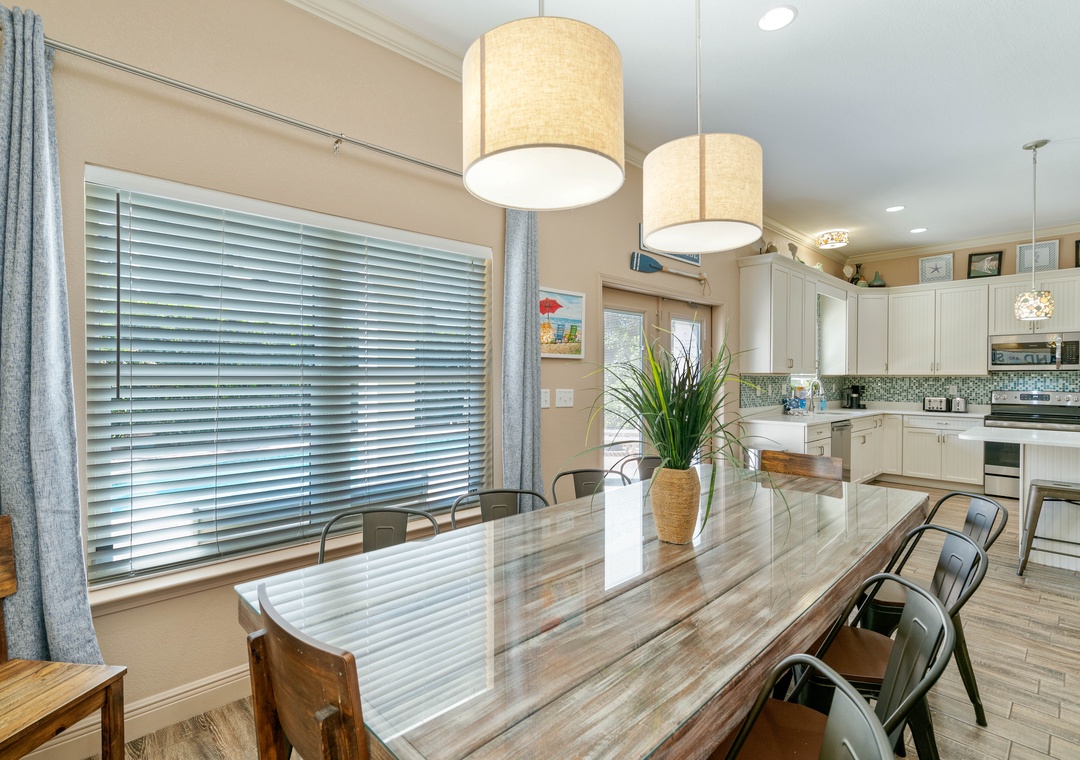 DINING ROOM: Located across from the kitchen and bar is the dining room. Enjoy your family meals at this large, handmade table that seats 12 people. Not only can you see the TV from this space, but it also has a front-row view of the backyard and pool.