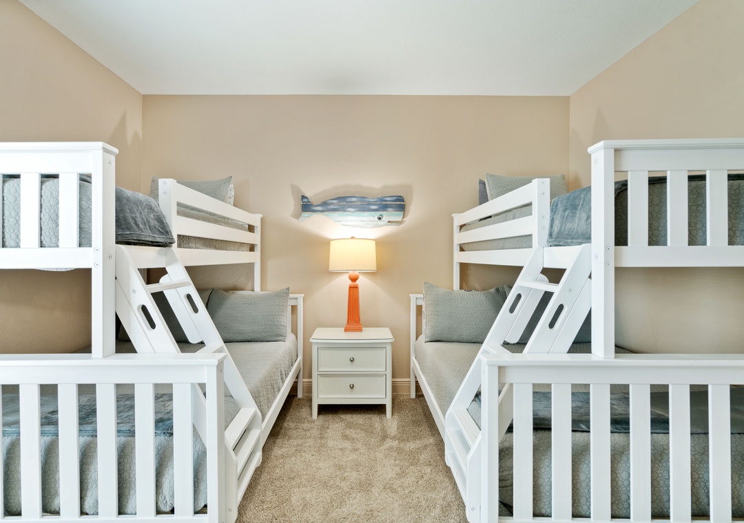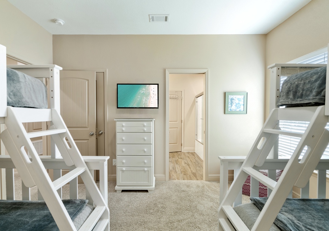 BEDROOM #5 (Bunk Room): This bunk bedroom is right at the top of the stairs. It’s furnished with TWO twin-over-full bunk beds, a dresser, 1 nightstand, and a flat-screen. It shares the Jack-and-Jill bathroom with Bedroom #6.
