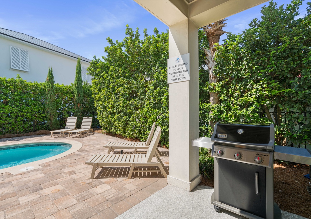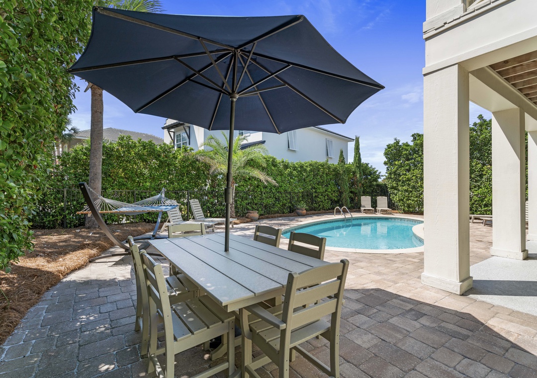 BACKYARD: Take a swim in the 28×15 ft. private saltwater pool. The lush backyard also has a table with an umbrella that seats 6. Plenty of lounge chairs, a hammock, and a gas grill. The pool can also be heated in the winter months.