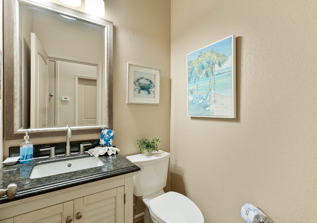 HALF BATH #6: This bathroom is located on the first floor, off of the main hallway. All of the bathrooms in the home have custom, built-in cabinetry with granite countertops.