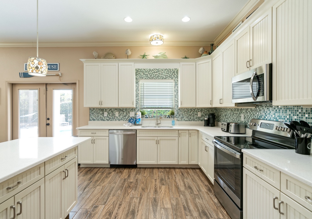 KITCHEN: This kitchen is fully stocked and ready to cook for large families. Includes a microwave, dishwasher, stove, 1 refrigerator, double toaster, Keurig, coffeepot, crock-pot, griddle, and blender, as well as all the normal utensils and cookware. Also has a center island bar with 7 bar stools.