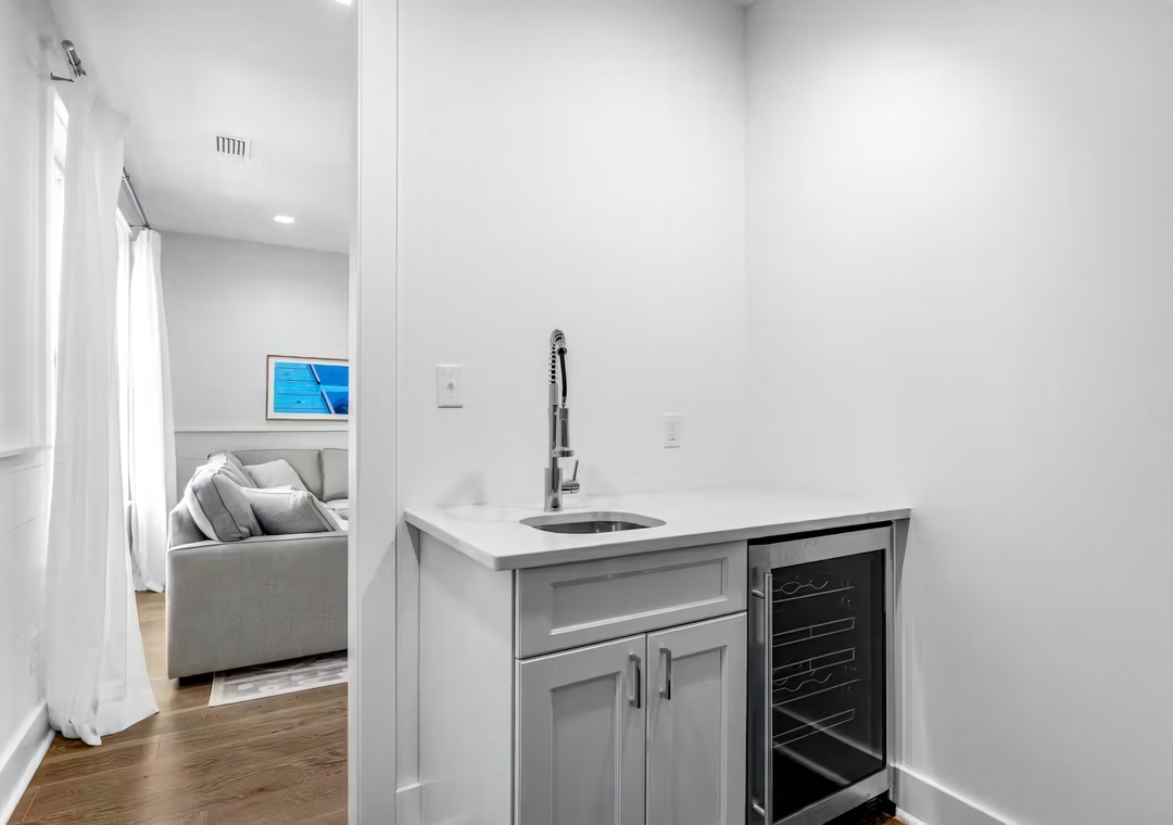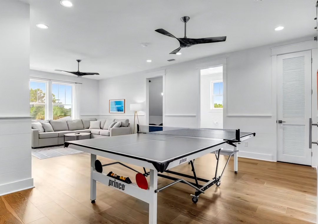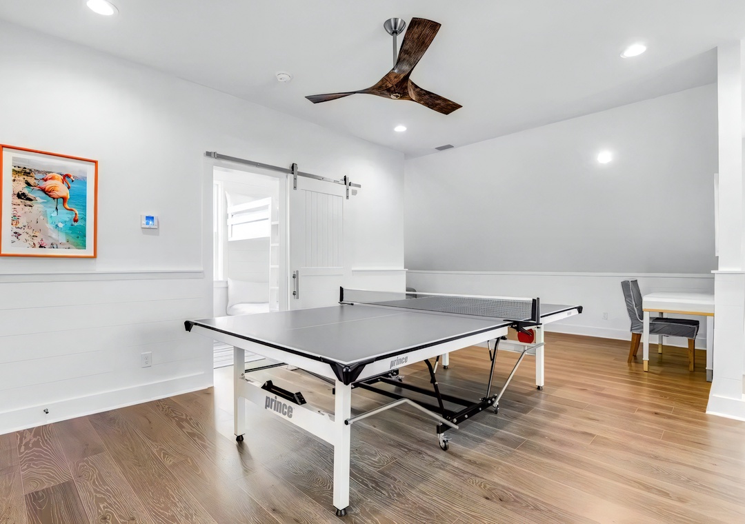 Lounge Area + Wet Bar: The 3rd floor lounge area features a ping pong table as the centerpiece, along with a comfortable sectional and mounted flat-screen TV for unwinding between games. The corner nook includes a wet bar with a sink and wine cooler, making this space ideal for casual hangouts, entertaining, and friendly competition.