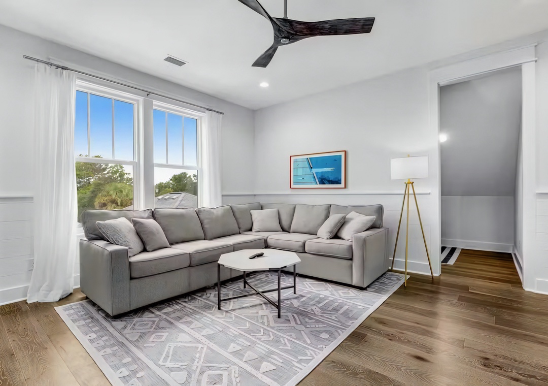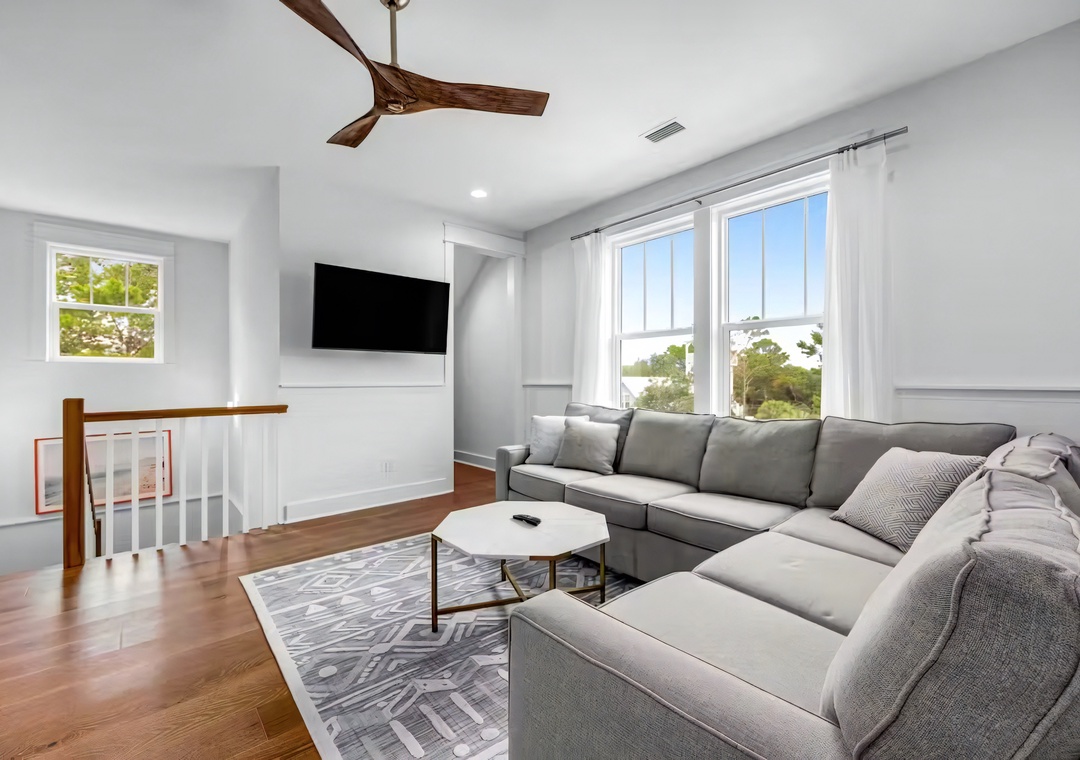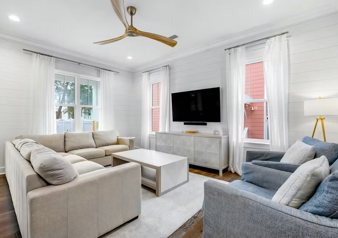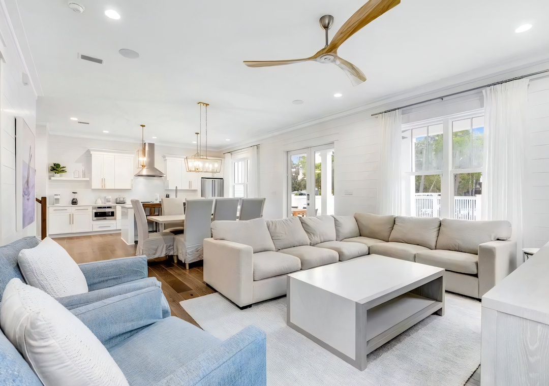 Living Room: The bright and spacious living room includes a large sectional and 2 accent chairs, a mounted flat-screen TV, and an open layout that flows seamlessly to the back patio. Coastal accents and abundant natural light create a comfortable space for gathering together.