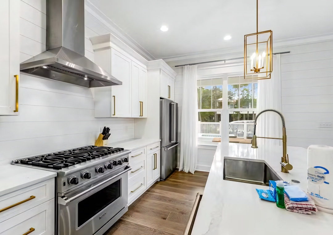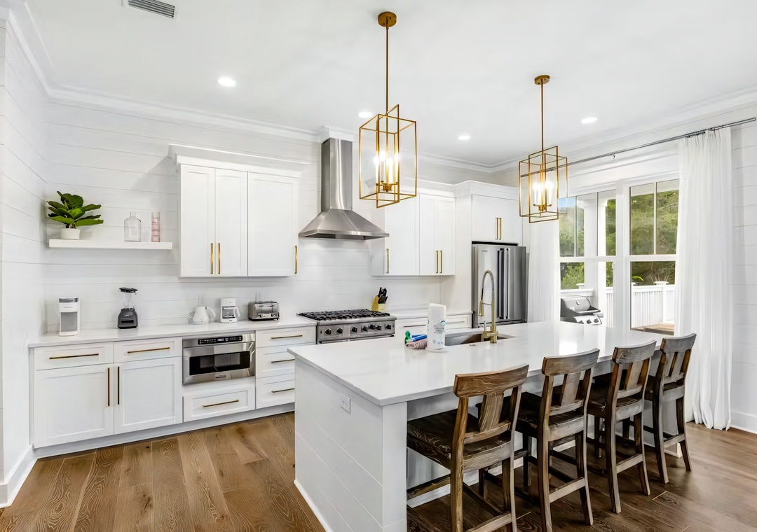 Kitchen: The spacious kitchen is fully equipped for preparing meals with family and friends and features all-white cabinetry, gold accents, and high-end appliances throughout. Amenities include a Viking 6-burner gas range, refrigerator, microwave, dishwasher, toaster, Keurig, coffeemaker, crockpot, griddle, and blender, along with all standard cookware and utensils. A large island with seating for 4 provides additional space for casual dining.