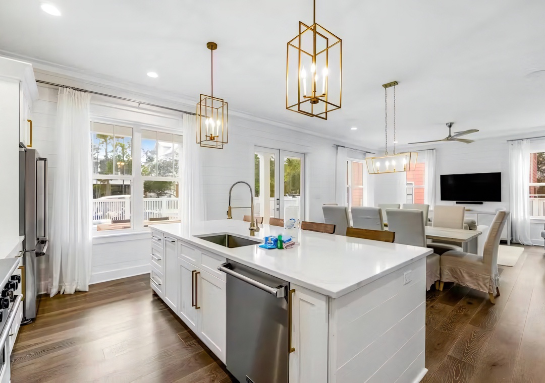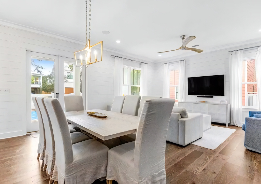 Dining Room: The dining area sits across from the kitchen, featuring a wooden table with seating for 8, highlighted by pendant lighting overhead.