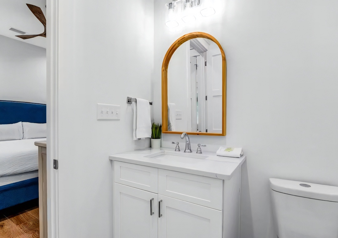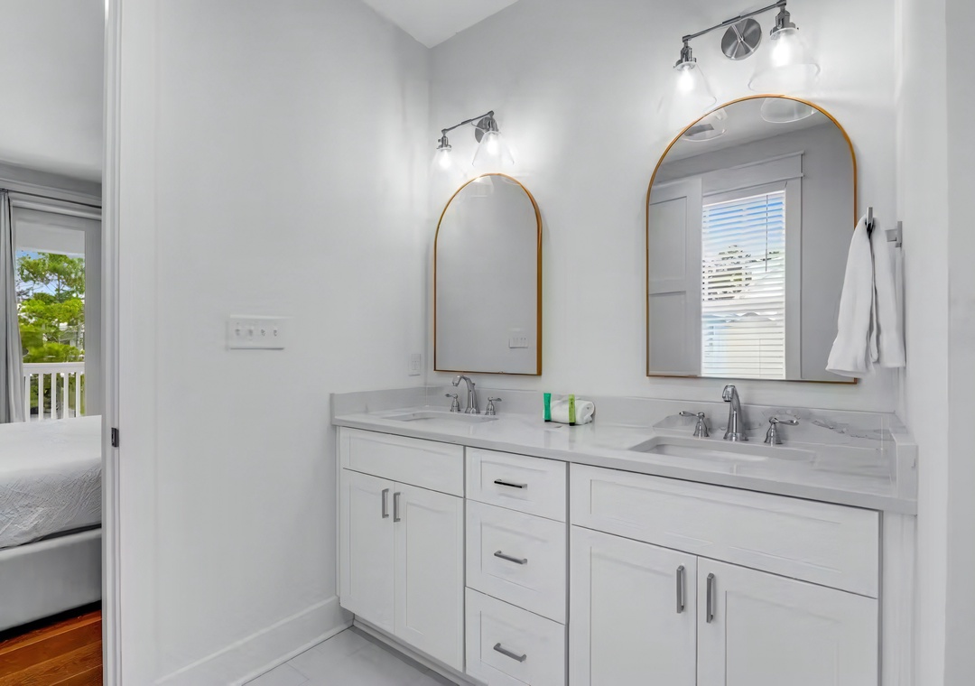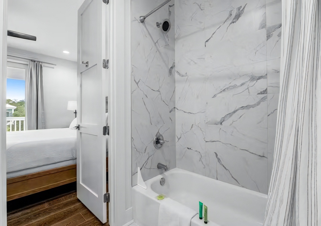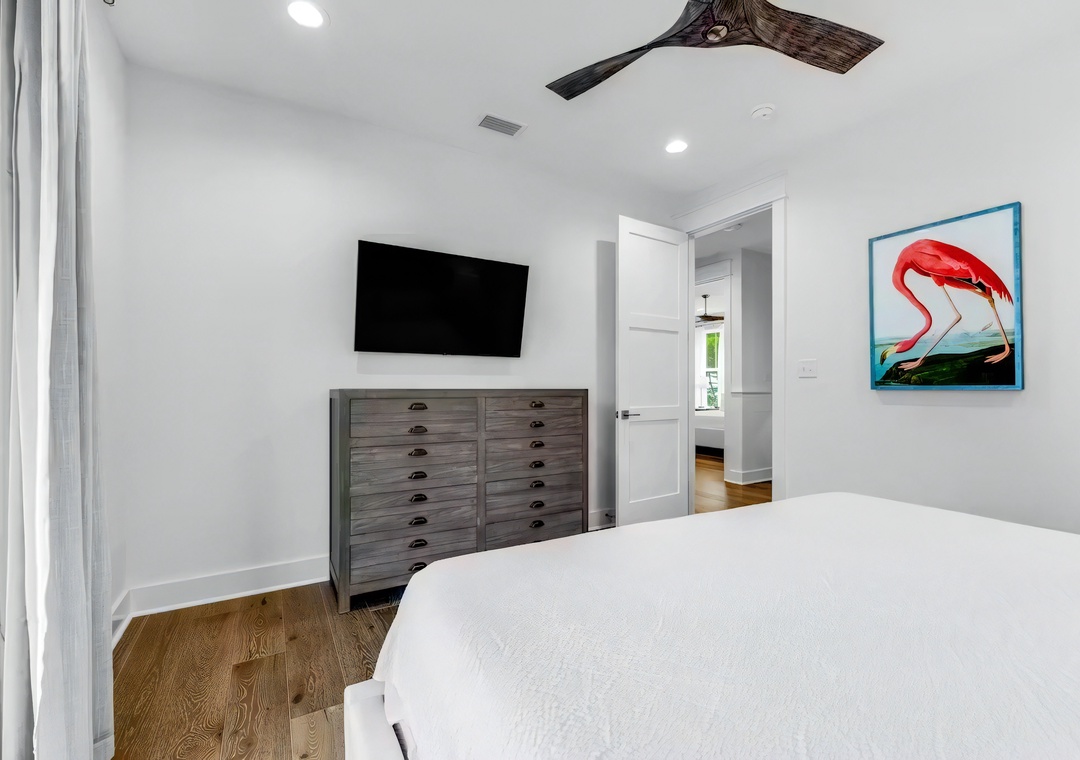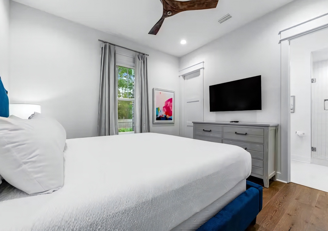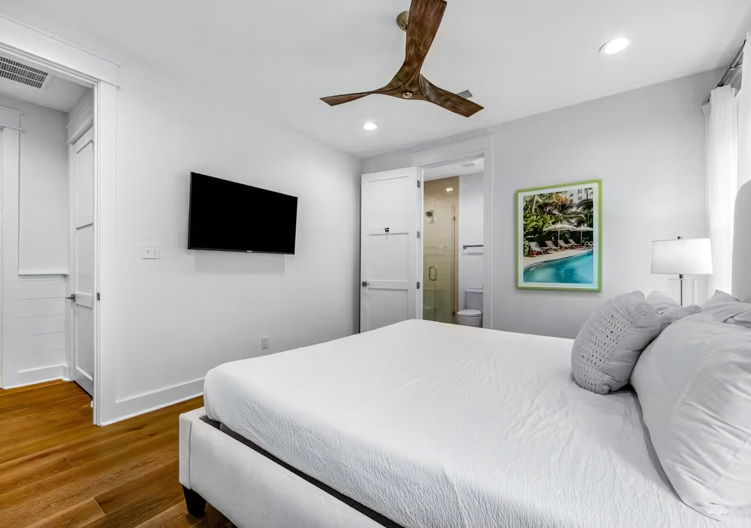 Bedroom + Bathroom #4: This bedroom includes a king-sized bed, 2 nightstands, a dresser, private closet, and flat-screen TV. It has direct access to the front balcony. There is a private bathroom attached with a Jack-and-Jill vanity and large walk-in shower.