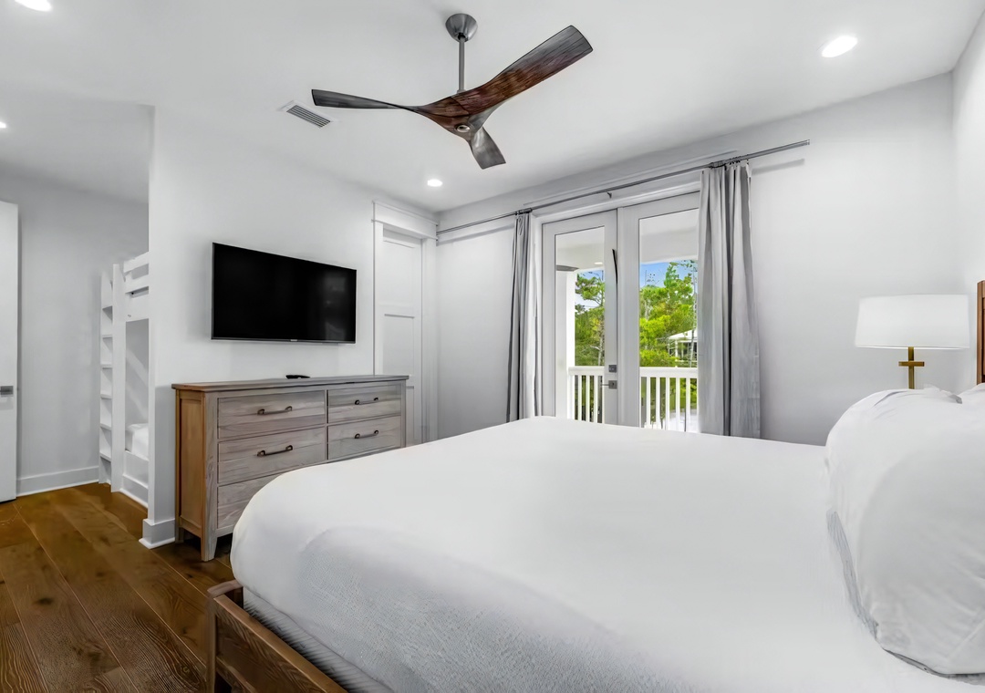 Bedroom + Bathroom #3: This bedroom includes a king-sized bed and twin/twin bunk, 2 nightstands, a dresser, private closet, and flat-screen TV. It has direct access to the front balcony. There is a private bathroom attached with a single vanity and shower/bathtub combination.